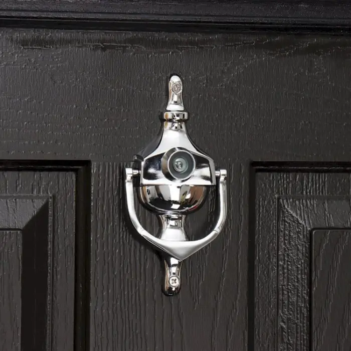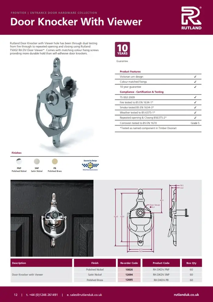 Rutland Door Knocker with Viewer hole has been through dual testing from fire through to repeated opening and closing using Rutland TS002 RH.DV Door Viewer*. Comes with matching colour fixing screws providing more durable hold than self-adhesive door knockers.